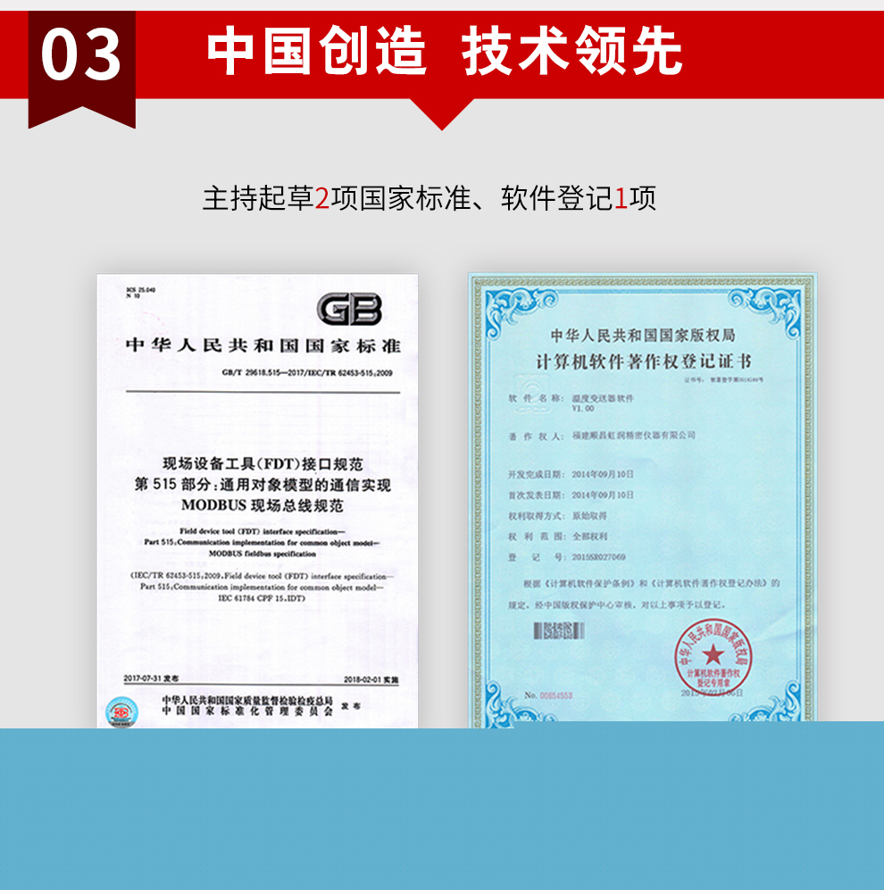 虹潤公司是專業(yè)生產(chǎn)溫度變送器的國家專精特新“小巨人”企業(yè)。生產(chǎn)的現(xiàn)場顯示隔離溫度變送器,具有可修改輸入信號類型,測量精度高,穩(wěn)定性好,帶HART或RS485通訊計等特點(diǎn)。該產(chǎn)品不僅通過德國萊茵 CE 認(rèn)證與 SIL 功能安全認(rèn)證,還獲得具備減震抗干擾能力的溫度變送器、信號隔離器、一種二端子模塊、無源信號隔離器等3項國家發(fā)明專利。主持起草物聯(lián)網(wǎng)智能溫度儀表、現(xiàn)場設(shè)備工具(FDT)接口規(guī)范、工業(yè)過程測量和控制系統(tǒng)用溫度變送器等3項國家標(biāo)準(zhǔn),以及通信系統(tǒng)多通道數(shù)據(jù)采集控制終端規(guī)范軍用標(biāo)準(zhǔn)。參與國際5G標(biāo)準(zhǔn)制定,取得高精度溫度變送器等3項相關(guān)軟件著作權(quán)。產(chǎn)品廣泛應(yīng)用于石油、化工、電力、冶金、制藥、食品、水處理等各種工業(yè)領(lǐng)域。