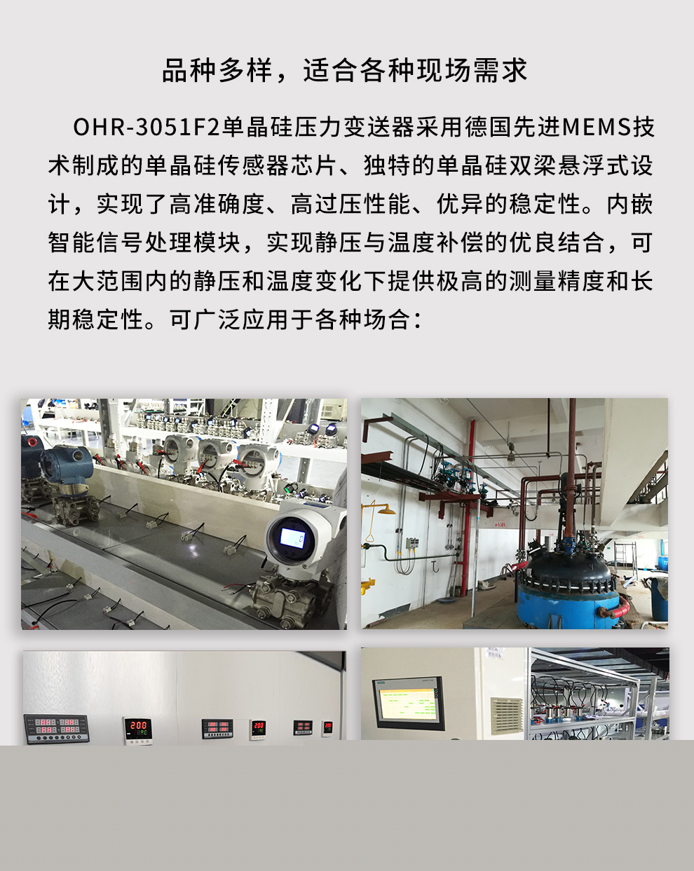 虹潤(rùn)公司是專業(yè)生產(chǎn)壓力變送器的國(guó)家專精特新“小巨人”企業(yè),生產(chǎn)的單晶硅壓力變送器,具有高精度,小溫漂,性能穩(wěn)定,帶HART通訊,抗干擾能力強(qiáng),自診斷功能等特點(diǎn)。產(chǎn)品獲得一種數(shù)字顯示低功耗壓力表、一種信號(hào)發(fā)生器裝置等2項(xiàng)國(guó)家發(fā)明專利,主持起草工業(yè)過(guò)程控制系統(tǒng)用模擬輸入兩位或多位輸出儀表、工業(yè)過(guò)程測(cè)量和控制系統(tǒng)用壓力/差壓變送器等2項(xiàng)國(guó)家標(biāo)準(zhǔn),通信系統(tǒng)多通道數(shù)據(jù)采集控制終端規(guī)范軍用標(biāo)準(zhǔn),以及現(xiàn)場(chǎng)設(shè)備集成等5項(xiàng)智能制造國(guó)家標(biāo)準(zhǔn)。參與國(guó)際5G標(biāo)準(zhǔn)制定,取得數(shù)顯壓力表等2項(xiàng)相關(guān)軟件著作權(quán)。產(chǎn)品廣泛應(yīng)用于化工、食品、制藥、電力、設(shè)備配套、供暖、水處理、樓宇等行業(yè),需精準(zhǔn)測(cè)量流體壓力的現(xiàn)場(chǎng)。