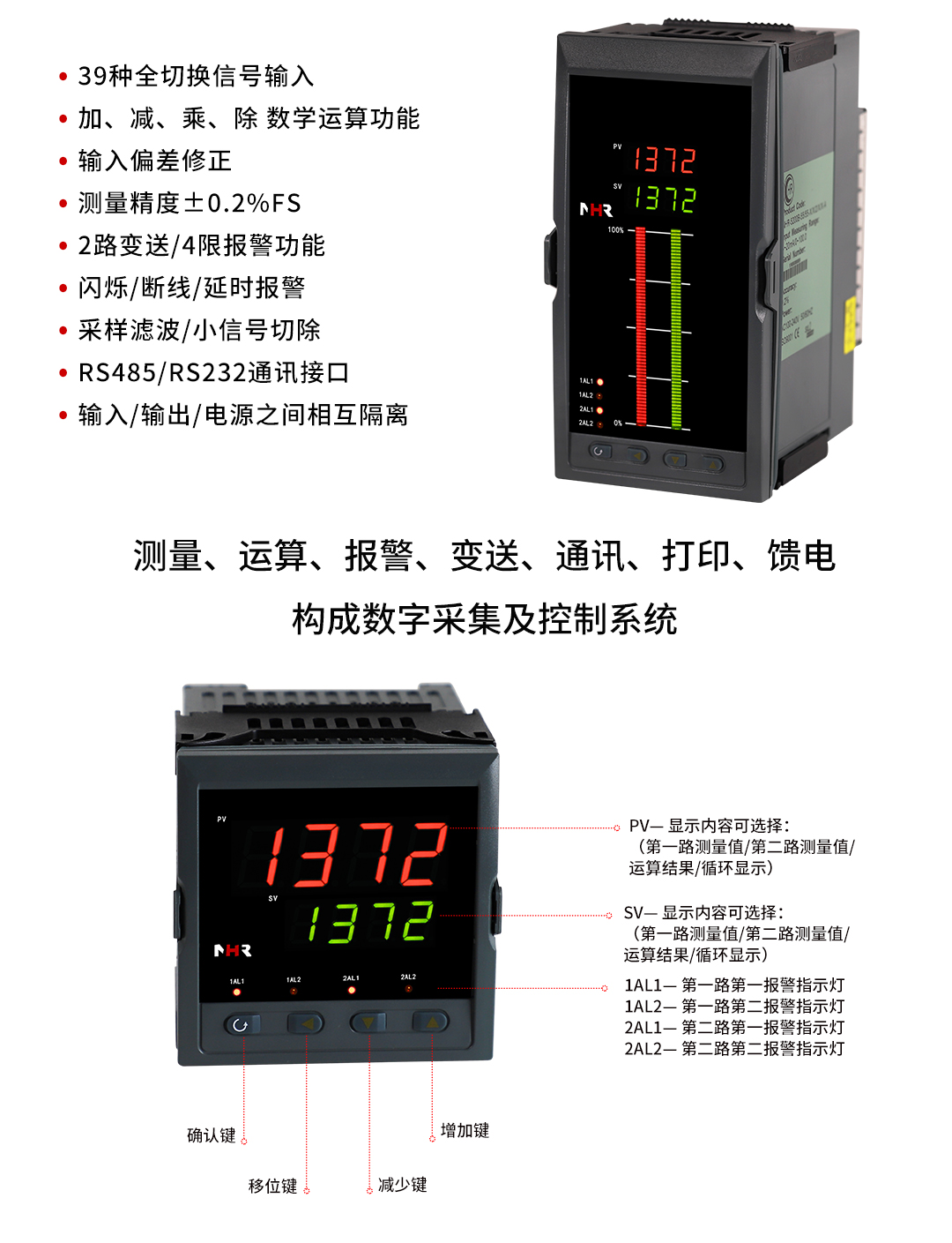 虹潤公司是專業(yè)生產(chǎn)數(shù)顯表的國家專精特新“小巨人”企業(yè),生產(chǎn)的智能雙路數(shù)顯儀表,具有全切換信號輸入,加減乘除數(shù)學運算,高抗干擾,過壓過流保護,RS485/RS232通訊等特點。產(chǎn)品獲得巡回檢測顯示方法及裝置、儀表殼體等2項國家發(fā)明專利,主持起草工業(yè)過程控制系統(tǒng)用模擬輸入兩位或多位輸出儀表、物聯(lián)網(wǎng)智能溫度儀表通用技術(shù)條件等2項國家標準,,以及通信系統(tǒng)多通道數(shù)據(jù)采集控制終端規(guī)范軍用標準,參與國際5G標準制定,取得雙回路數(shù)字顯示控制儀表等3項相關(guān)軟件著作權(quán)。產(chǎn)品廣泛應用于電力、石化、冶金、化工、造紙、食品、輕工、制藥、熱處理、水處理、機械配套等各種工業(yè)現(xiàn)場。