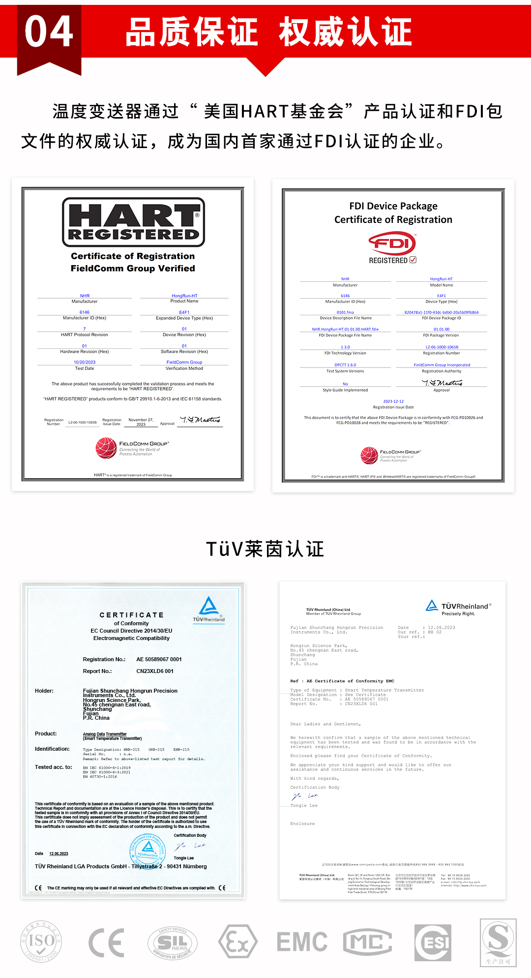 虹潤公司是專業(yè)生產溫度變送器的國家專精特新“小巨人”企業(yè)。生產的智能溫度變送器,具有適配各類溫度傳感器,精度高,通過編程線修改輸入信號類型及量程,高抗干擾,HART或485通訊等特點。該產品不僅通過HART基金會認證、德國萊茵 CE 認證與 SIL 功能安全認證,還獲得具備減震抗干擾能力的溫度變送器、信號隔離器、一種二端子模塊、無源信號隔離器等4項國家發(fā)明專利,主持起草物聯(lián)網智能溫度儀表、現(xiàn)場設備工具(FDT)接口規(guī)范、工業(yè)過程測量和控制系統(tǒng)用溫度變送器等3項國家標準,以及通信系統(tǒng)多通道數據采集控制終端規(guī)范軍用標準,參與國際5G標準制定,取得HART溫度變送器、智能溫度變送器等3項相關軟件著作權。產品廣泛應用于石油、化工、電力、冶金、制藥、食品、水處理等各種工業(yè)領域。